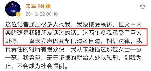 早在2020年12月,朱軍就曾公開(kāi)發(fā)文力證清白,稱自己這么多年來(lái)承受了很多無(wú)端的指責(zé)與羞辱,他相信法律會(huì)讓真相大白。