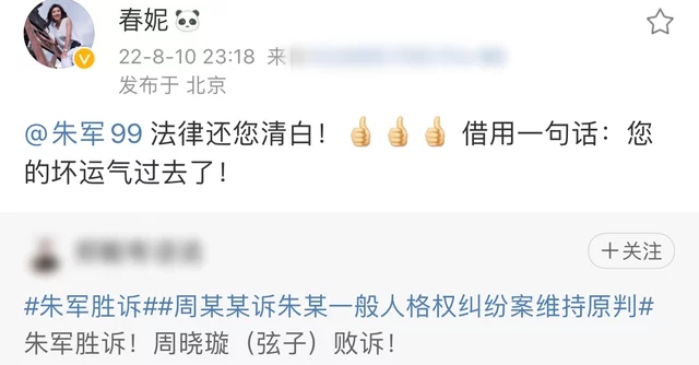 春妮特意艾特朱軍,直言:“法律還您清白!借用一句話:您的壞運(yùn)氣過(guò)去了!”字里行間,足以感受到她的激動(dòng)與喜悅之情。