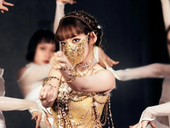 程瀟《蒙面舞王》舞蹈版《吉巴羅》金色亮片裙蒙面,異域風情造型眼神魅惑。