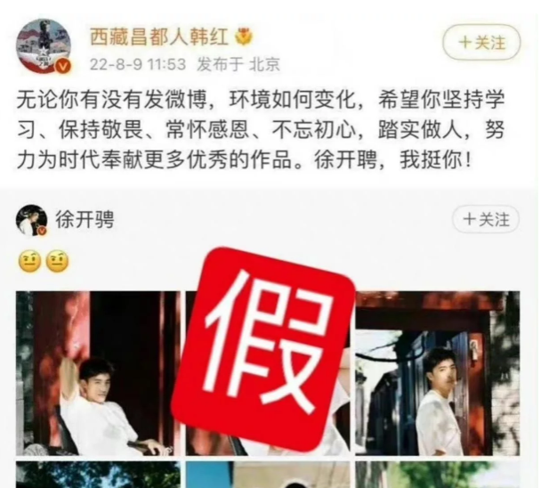當天,一則“韓紅力挺徐開騁”的截圖更是在網(wǎng)絡(luò)上廣為流傳,截圖顯示韓紅(明星經(jīng)紀公司)在8月9日發(fā)布微博,回復(fù)了徐開騁“無論你有沒有發(fā)微博,環(huán)境如何變化,希望你堅持學(xué)習(xí)、保持敬畏、常懷感恩、不忘初心,踏實做人,努力為時代奉獻更多優(yōu)秀的作品。徐開聘,我挺你!”