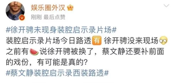 緊接著,又有多個爆料賬號稱徐開騁已經(jīng)被《裝腔》劇組開除,換了新人接手,搭檔蔡文靜需要補(bǔ)拍前面已經(jīng)拍完的雙人戲份,大概需要15天。