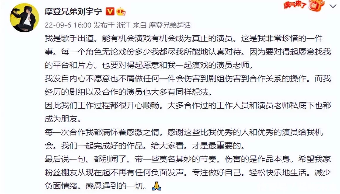對每一次的合作都很感激,一起完成好的作品最重要。也再次呼吁“都別鬧了”,帶一些莫名其妙的節(jié)奏,傷害了作品,希望自己的粉絲“棚友”能夠不再就負(fù)面發(fā)聲,專注自己。
