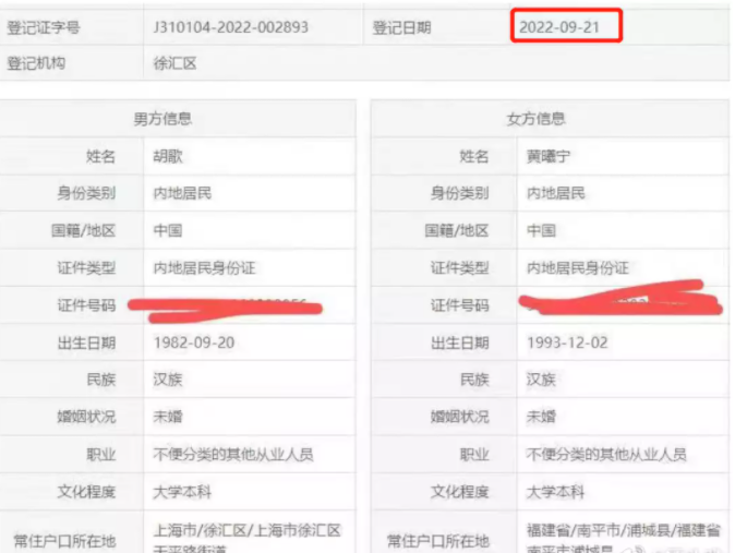 隨后疑似胡歌和妻子的結婚登記截圖曝光。截圖顯示,兩人是在2022年9月21日結婚,當天也正好是胡歌生日的第二天。女方名叫“黃曦寧”,1993年出生,福建人,比胡歌小11歲。