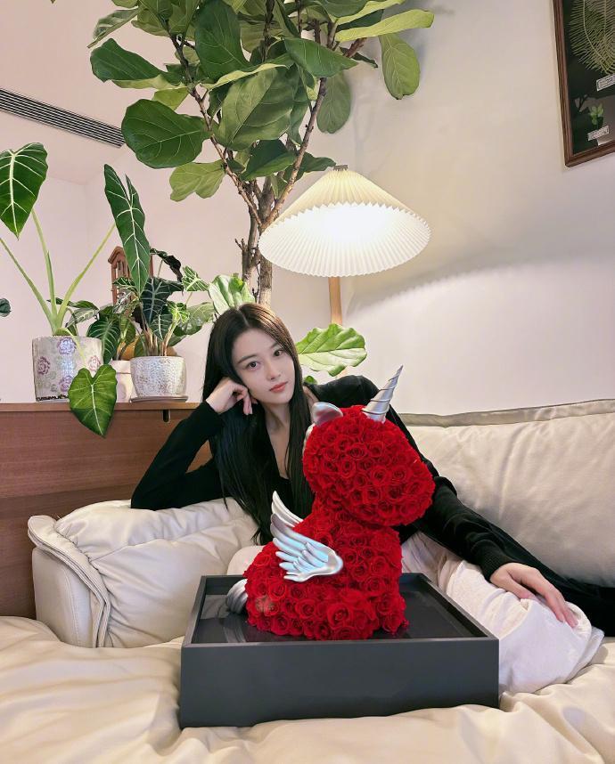 可以看出,其拍攝背景是在她與何捷的廣州家中,張馨予姿勢慵懶地坐在沙發(fā)上,雙眼含情直視鏡頭,黑長直造型下得她看上去溫柔嫵媚,而擺在她面前的是一個獨角獸造型的花束,由艷麗的紅玫瑰組成,不得不說,這份禮物的確獨到且用心。