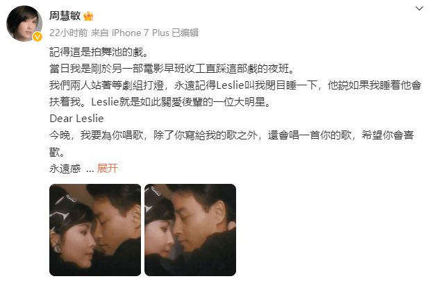 周慧敏在社交平臺(tái)上發(fā)文追憶張國榮,回憶了當(dāng)初張國榮留給她記憶最深刻的一幕。“記得這是拍舞池的戲。當(dāng)日我是剛于另一部電影早班收工直踩這部戲的夜班。我們兩人站著等劇組打燈,永遠(yuǎn)記得Leslie叫我閉目睡一下,他說如果我睡著他會(huì)扶著我。Leslie就是如此關(guān)愛后輩的一位大明星。”