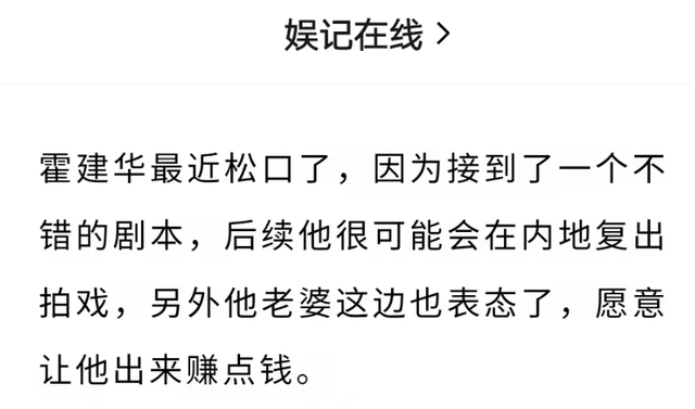 就在4月16日,知名娛記在個人社交媒體爆料,霍建華接到了一個不錯的劇本,打算在內(nèi)地復(fù)出拍戲,同時林心如也表態(tài)支持霍建華,愿意他出來賺點(diǎn)錢。