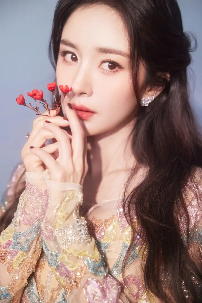 楊冪手持紅色小花,朦朧曖昧。