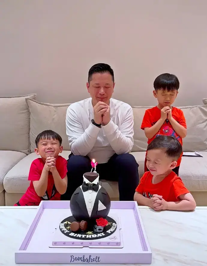 李乘德和三個兒子對著蛋糕許愿,兒子呆萌可愛。