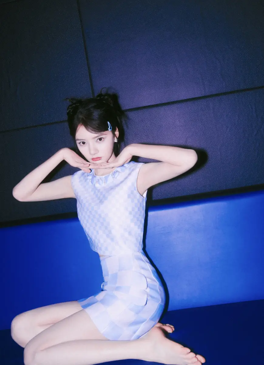 4月17日,任敏穿藍(lán)色無(wú)袖套裝,扎雙丸子頭別發(fā)夾,手托下巴表情靈動(dòng)好俏皮,沙發(fā)上拍照秀盈盈細(xì)腰和一雙修長(zhǎng)美腿。
