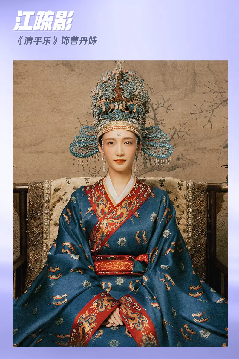 江疏影《清平樂》中飾演皇后曹丹姝,華麗的后冠搭配紅藍色朝服,主打的就是一個雍容大氣,非常古典。
