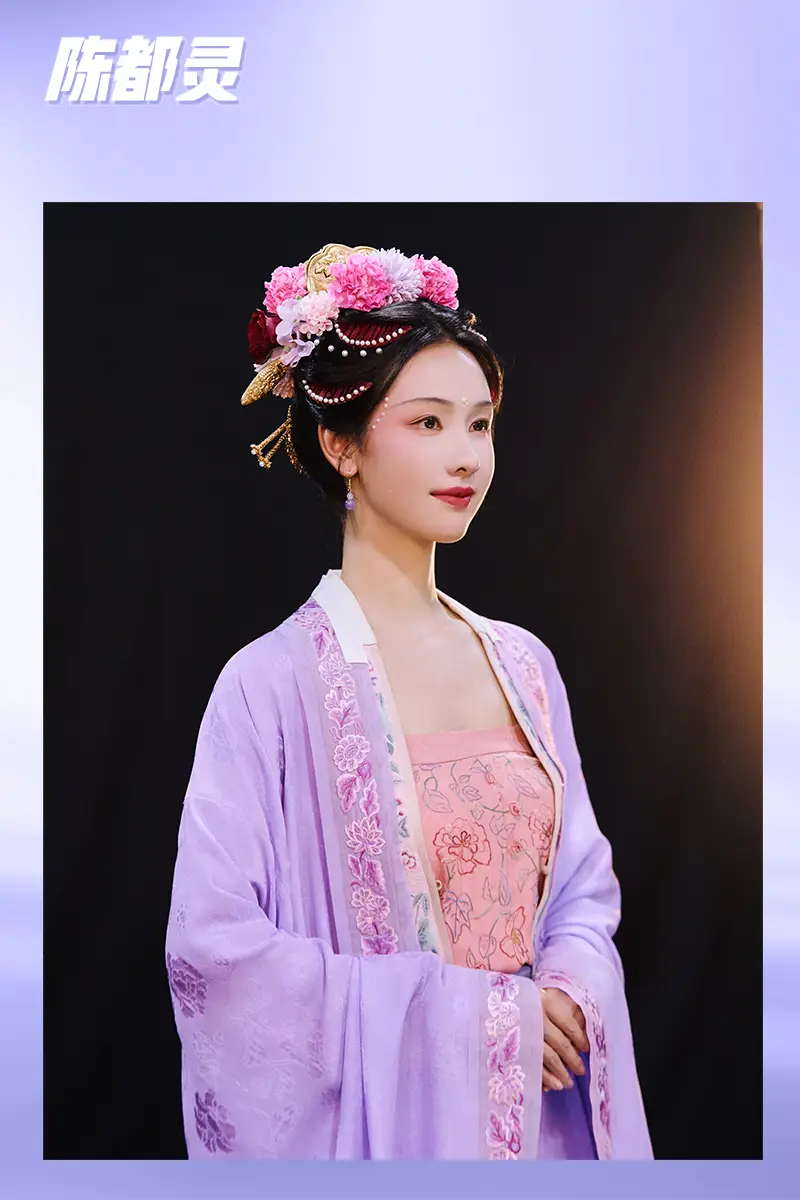 陳都靈在《國家寶藏》中飾演一位南宋女子,珍珠被貼在兩側(cè)太陽穴的位置和眉心處,粉紫色的簪花頭飾搭配同色系的服飾,風華盡顯!