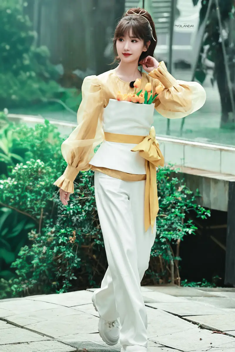 毛曉彤一身黃白套裝比例優(yōu)越。