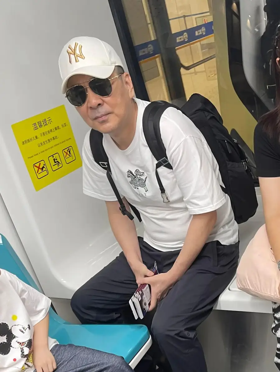 陳建斌戴著帽子和墨鏡,穿白T恤搭配長褲,十分休閑。