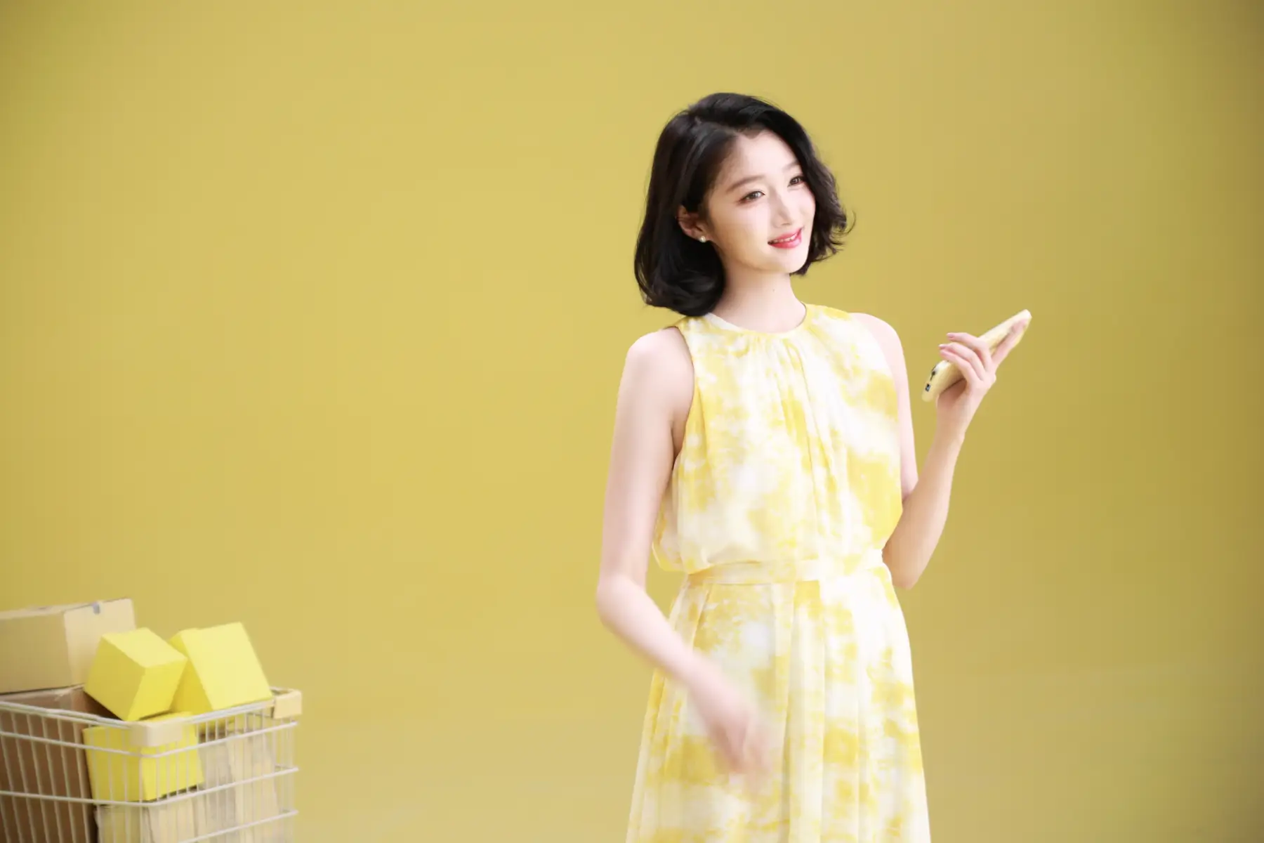 關(guān)曉彤著鵝黃色連衣裙元?dú)馓鹈?莞爾淺笑像瓷娃娃