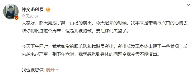 5月25日,陳奕迅(明星經(jīng)紀公司)在杭州演唱會開場前登臺宣布,因自己聲帶不適,本周末兩場演唱會將延期至5月27日、28日,并含淚鞠躬致歉。主辦方工作人員承諾除了將為想退票的觀眾全額退款外...