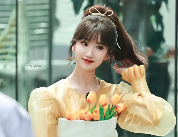 近日,毛曉彤(明星經紀公司)在綜藝中的一組黃色郁金香造型釋出,胸前插滿鮮花甜美動人。