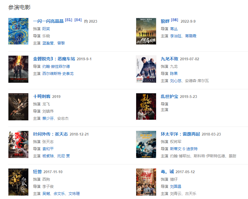 代表作品:殺破狼2、葉問3、一代宗師、澳門風(fēng)云、水月洞天、靈鏡傳奇