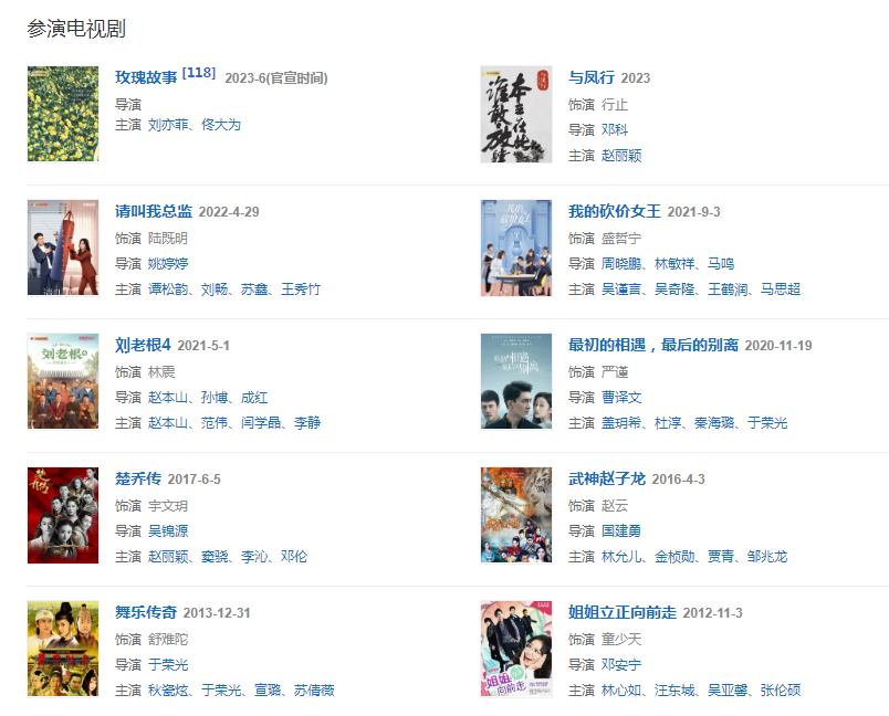 代表作品:狄仁杰之神都龍王、痞子英雄之黎明升起、智取威虎山、三少爺?shù)膭?、楚喬傳、武神趙子龍、步步驚心、同桌的你
