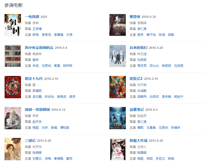 代表作品:捉妖記、失孤、風(fēng)中有朵雨做的云、相愛穿梭千年、攀登者、全城熱戀、后來的我們、等風(fēng)來