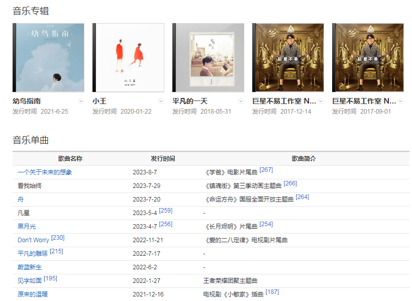 代表作品:像我這樣的人、平凡的一天、如果有一天我變得很有錢、消愁、感覺自己是巨星、借、不染、無問、小王、盛夏、二零三、深夜一角、給你給我、一葷一素、海上日記 、城市傍晚 、于是沒有洗頭