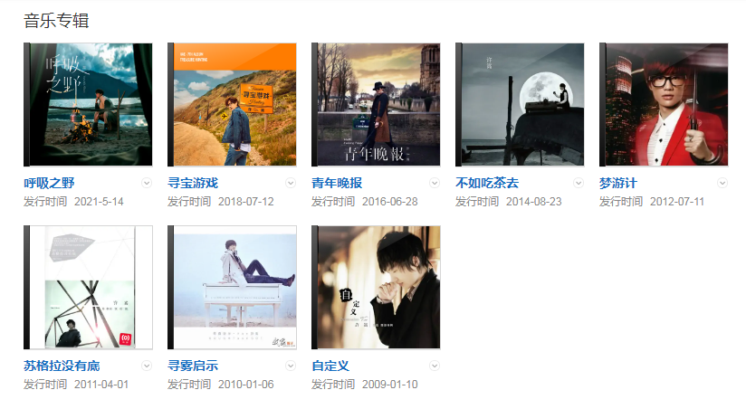 代表作品烏鴉、龐貝、三尺、昨夜書、雨幕、最佳歌手、雅俗共賞、老古董、山水之間、玫瑰花的葬禮、有何不可、清明雨上、千百度、如果當(dāng)時(shí)、半城煙沙、幻聽(tīng)、斷橋殘雪、廬州月、驚鴻一面、多余的解釋、城府、你若成風(fēng)、飛馳于你