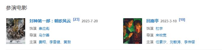2023年3月,出演懸疑電影《回廊亭》、懸疑劇《回響》;7月20日,出演的神話(huà)史詩(shī)電影《封神第一部:朝歌風(fēng)云》上映 。