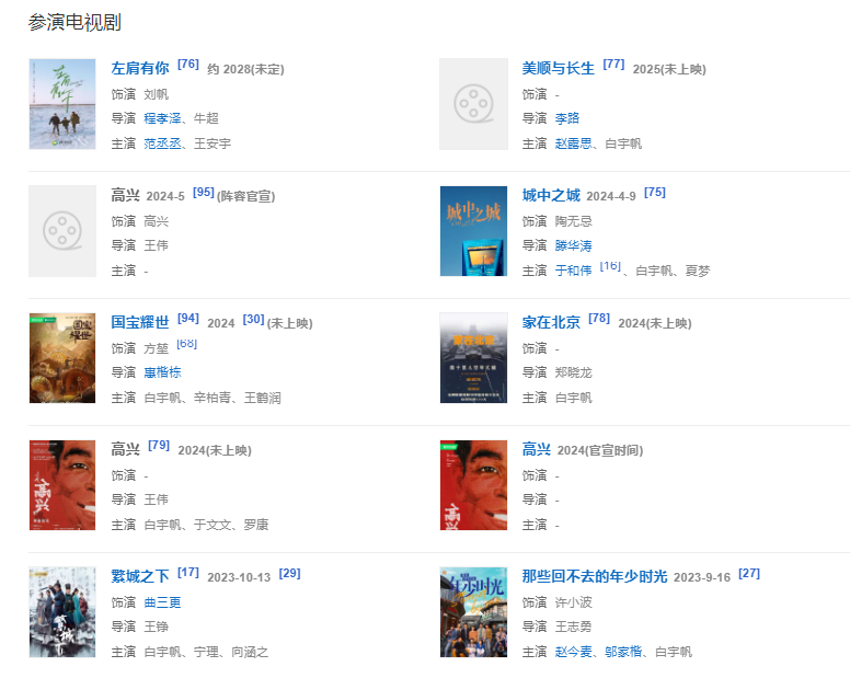 2019年10月,主演的古裝劇《戀戀江湖》播出,他也因此正式出道。作為一名95后青年演員,白宇帆的演藝事業(yè)并非一帆風(fēng)順,起初他只是在一些電影、電視劇中客串小角色,直到2021年1月,其主演的電視劇《山海情》播出,才因飾演馬得寶一角而為觀眾所熟知;同年7月,主演的都市話題劇《我在他鄉(xiāng)挺好的》播出;同年10月,主演的家庭懸疑劇《八角亭謎霧》播出。