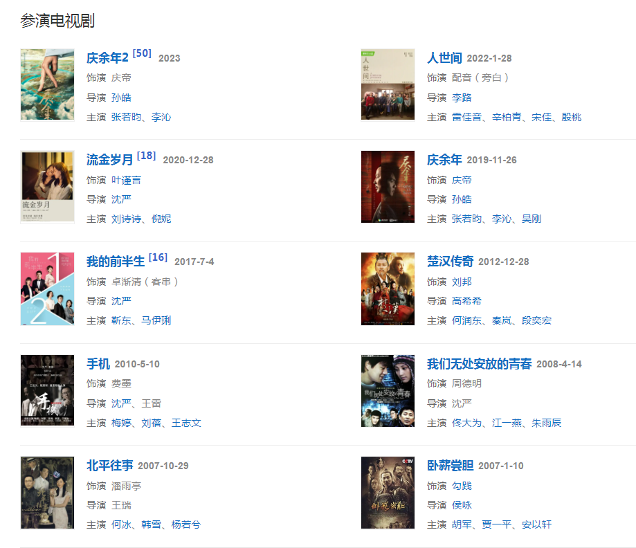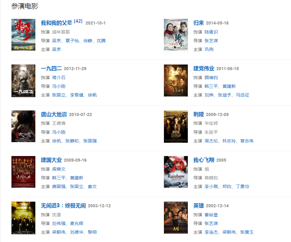 代表作品:慶余年、寇老西兒、末代皇帝、圍城、康熙王朝、我的1919、唐山大地震、我心飛翔、楚漢傳奇、歸來、一九四二、長征