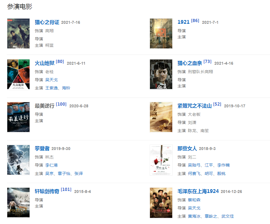 2021416日,主演的刑偵破案電影《獵心之血親》,在片中飾演刑警隊長高翔;611日,領銜主演電影《火山地獄》上映;716日,主演的懸疑網(wǎng)絡電影《獵心之骨證》在西瓜視頻獨家上線,在片中飾演刑警高翔。927日,參演的電視劇《燃燒大地》在山東衛(wèi)視和安徽衛(wèi)視晚間黃金檔同步播出,網(wǎng)絡平臺由芒果TV獨家播出; 參演電影《1921》。