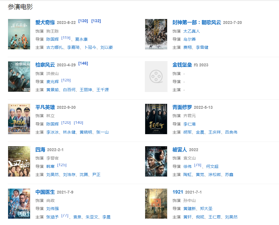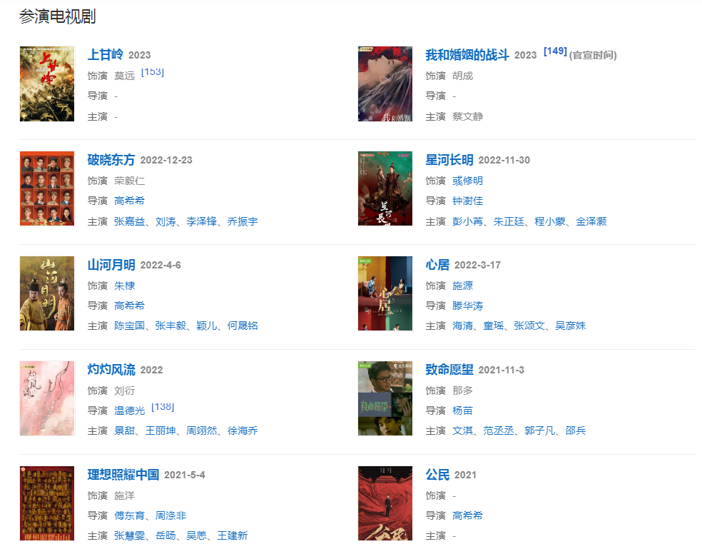 代表作品:宮鎖心玉、鴻門宴傳奇、狼圖騰、后會無期、知否知否應是綠肥紅瘦、蘭陵王、狄仁杰之神都龍王、黃金時代