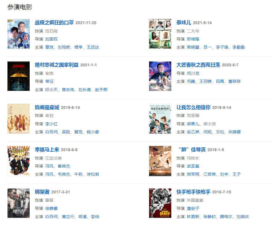 2021年8月30日,參演冒險網(wǎng)絡(luò)劇《云南蟲谷》播出,飾演馬真人;11月20日,主演的電影《戰(zhàn)疫之瘋狂的口罩》定檔上映;12月30日,特別出演的首部中國大媽浪漫爆笑短劇《大媽的世界》播出。
