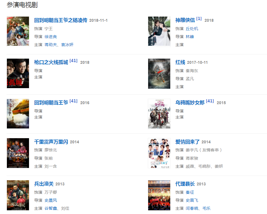 2018年,出演抗日諜戰(zhàn)劇《紅線》中的秦海東;同年,確定出演由林峰執(zhí)導的古裝武俠劇《神雕俠侶》。