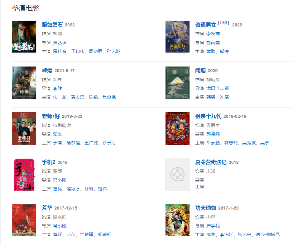 代表作品:康熙微服私訪記、鐵齒銅牙紀曉嵐、忠誠、金婚、頑主、手機、一聲嘆息、建國大業(yè)、中國1945之重慶風(fēng)云、一九四二