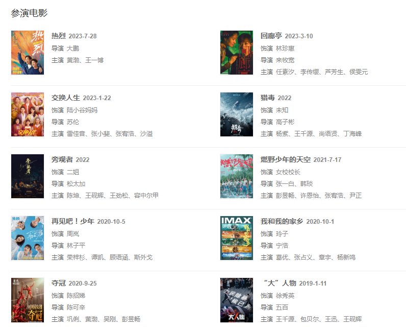 代表作品:湄公河大案、瑯琊榜、偽裝者、因為遇見你、歡樂頌、帶著爸爸去留學、精英律師
