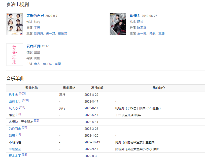 2019年6月27日,與肖戰(zhàn)、王一博、孟子義等人共同出演的古裝仙俠劇《陳情令》播出,在劇中飾演白瞳少女阿箐,并與孫伯綸共同為該劇演唱了義城組人物曲《孤城》。