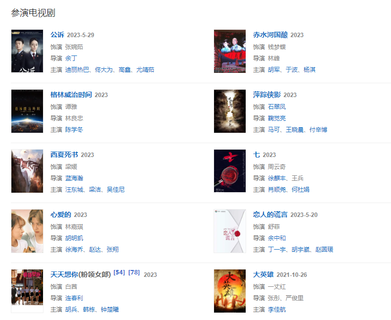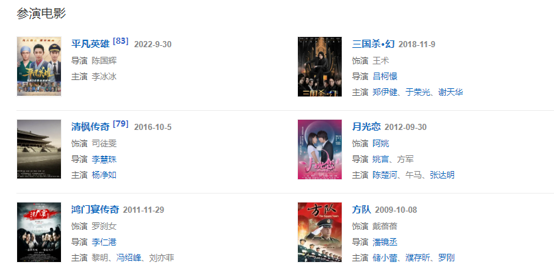 代表作品:八仙全傳、天龍八部、鏢門、鹿鼎記、妻子的謊言、怒江之戰(zhàn)、維和步兵營