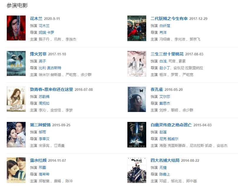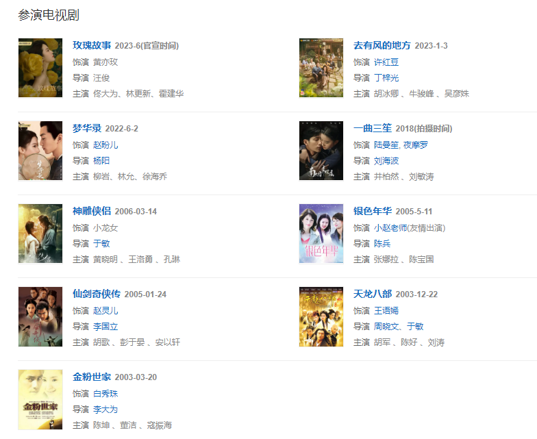 代表作品:花木蘭、二代妖精之今生有幸、功夫之王、銅雀臺、神雕俠侶、仙劍奇?zhèn)b傳、倩女幽魂、烽火芳菲、夜孔雀