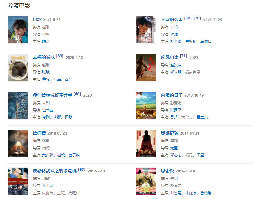 202164日,參演電影《山歌》播出,飾演趙琳。