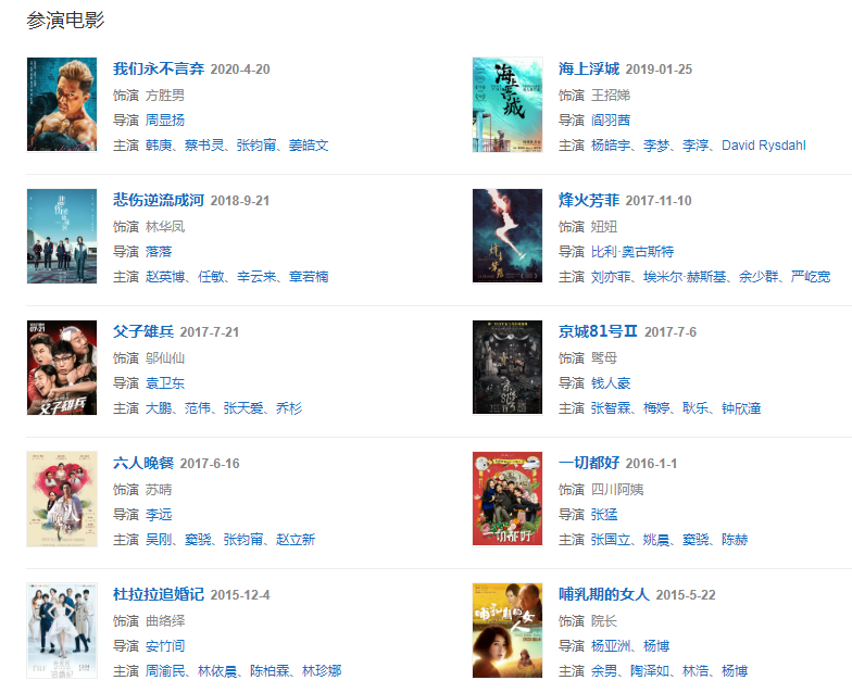 代表作品:蝸居、枕邊書、末代皇帝、宋家皇朝、玫瑰漩渦、辣媽正傳、六人晚餐、上海紅美麗、如懿傳、加油,你是最棒的、精英律師、建國大業(yè)