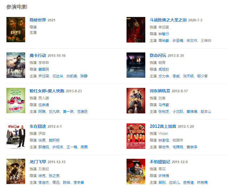 2012年,主演的古裝喜劇片《河?xùn)|獅吼Ⅱ》上映。2013年,出演的古裝劇《精忠岳飛》播出。