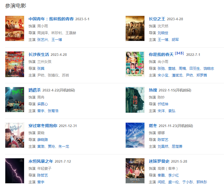 2022年1月,在文化類(lèi)綜藝節(jié)目《朗讀者第三季》中朗讀《小敘事》;同年,參加《百花迎春》晚會(huì),與靳東、吳京等人共同講述《致百花》。同年,與劉昊然、屈楚蕭主演的電影《燃冬》 ;3月17日,為電影《你是我的春天》獻(xiàn)唱的主題曲《想看你笑的樣子》發(fā)布;同年,主演由陳道明擔(dān)任總策劃、黃渤擔(dān)任監(jiān)制的抗疫電影《你是我的春天》;4月,參演的電影《熱搜》殺青。4月22日,與章宇、張宥浩領(lǐng)銜主演的電影《鸚鵡殺》宣布開(kāi)機(jī)。2022年,周冬雨參演獻(xiàn)禮“二十大”影片《中國(guó)青年:我和我的青春》(暫定名);5月23日,參加紀(jì)念毛澤東同志《在延安文藝座談會(huì)上的講話(huà)》發(fā)表八十周年暨慶祝大眾電影百花獎(jiǎng)創(chuàng)立六十周年特別節(jié)目。