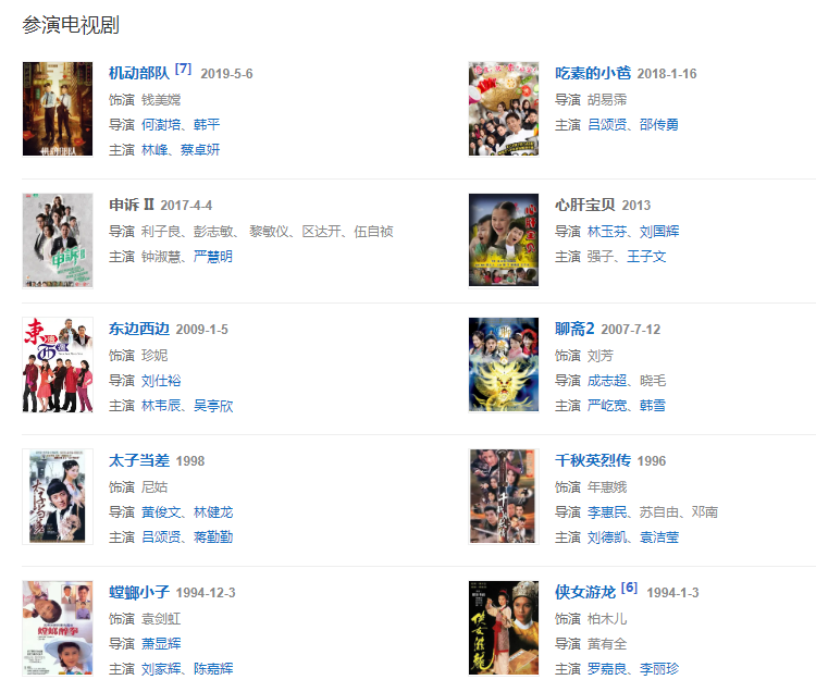 曾參與拍攝了《仙履奇緣》、《古惑女之決戰(zhàn)江湖》、《新男歡女愛》、《水滸英雄傳》、《機動部隊》和《 龍的天空》等電視劇,電影《白發(fā)魔女》和《古惑女》等。