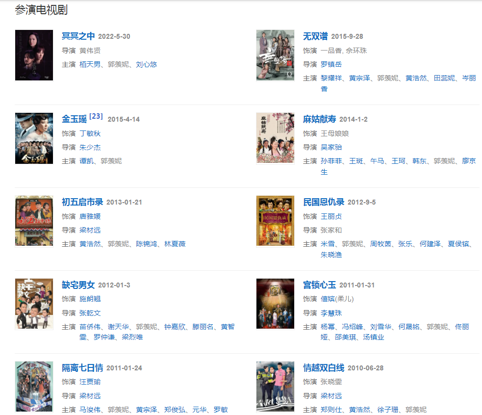 2008年,與郭晉安主演TVB時(shí)裝劇《古靈精探B》,在劇中飾演警探于子朗的妻子邢晶晶。