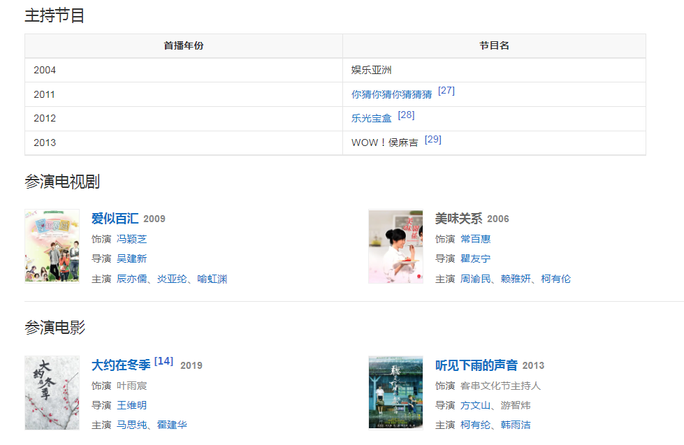 2004年,侯佩岑憑主播新聞成名,隨后成為東風(fēng)衛(wèi)視節(jié)目《娛樂亞洲》的主持人。