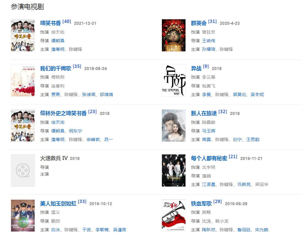 2016年3月29日,都市商戰(zhàn)題材電視劇《我們的千闕歌》在杭州開(kāi)機(jī),5月13日,與杜若溪合作主演民國(guó)懸疑探案劇《同謀者》在地面頻道首輪播出,10月20日,陳鍵鋒主演民國(guó)奇幻懸疑劇《異戰(zhàn)》,。