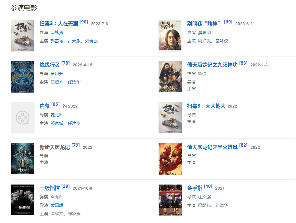 2022年4月15日,與任賢齊、任達華等主演的犯罪嫌疑電影《邊緣行者》上映 ;參演網(wǎng)絡(luò)電影《倚天屠龍記之圣火雄風》《倚天屠龍記之九陽神功》。6月,參演的由郭富城、任達華、吳鎮(zhèn)宇主演的麥兆輝執(zhí)導(dǎo)的犯罪電影《內(nèi)幕》宣布開機。