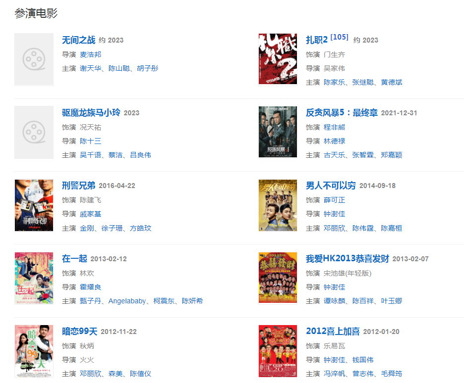 代表作品:我的野蠻奶奶、潛行狙擊、護(hù)花危情、偏偏喜歡你、少年神探狄仁杰、飛虎之雷霆極戰(zhàn)、點(diǎn)金勝手