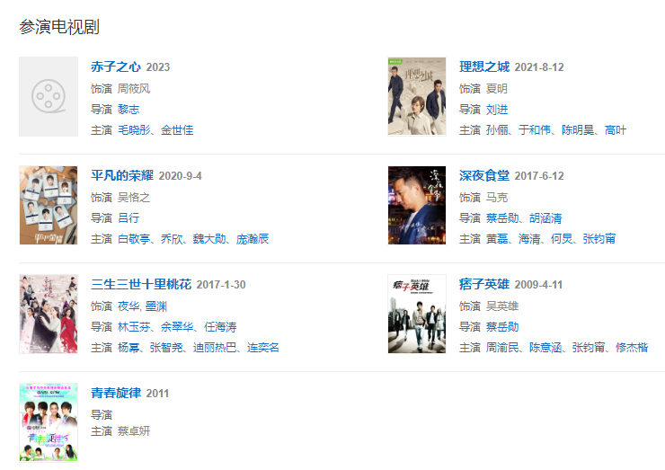 代表作品:艋舺、搜索、痞子英雄、南極之戀、三生三世十里桃花、狄仁杰之神都龍王、致我們終將逝去的青春、平凡的榮耀