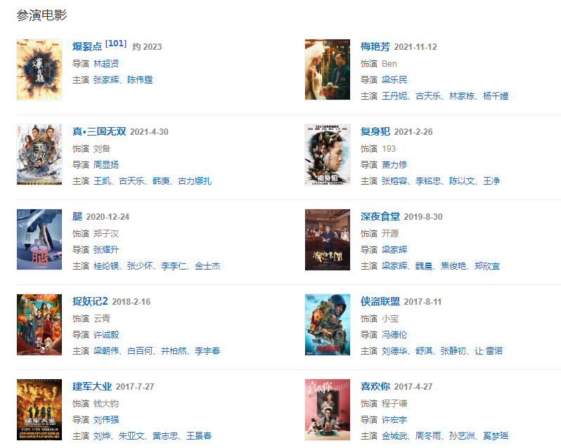 2013年在電影《總鋪師》中飾演葉如海,在電影《大尾鱸鰻》中飾演賀祥;