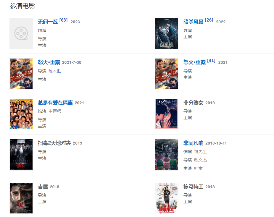 2001年與惠英紅合作出演電影《追兇》該片與2002年在大陸上映。